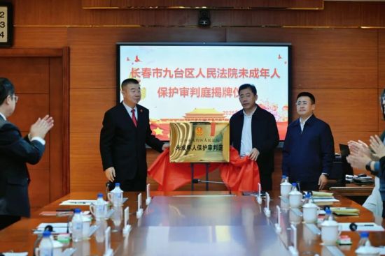 在热烈的掌声中,长春市九台区委常委、政法委书记孙文斌、长春市九台区副区长、市公安局九台分局局长秦力民与邵杰共同为“长春市九台区人民法院未成年人保护审判庭”揭牌。