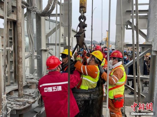 1月24日,山东栖霞笏山金矿事故救援取得新进展,已取得联系的11人全部成功升井。上午11时许,救援人员从井筒进入四中段(距地面546米),成功救出1人,升井并送医救治,随后又陆续救出10名被困矿工。图为救援现场。山东栖霞笏山金矿爆炸事故应急救援指挥部 供图