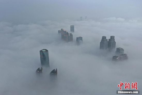 4月27日,航拍青岛浮山湾出现的平流雾景观。图片来源:视觉中国
