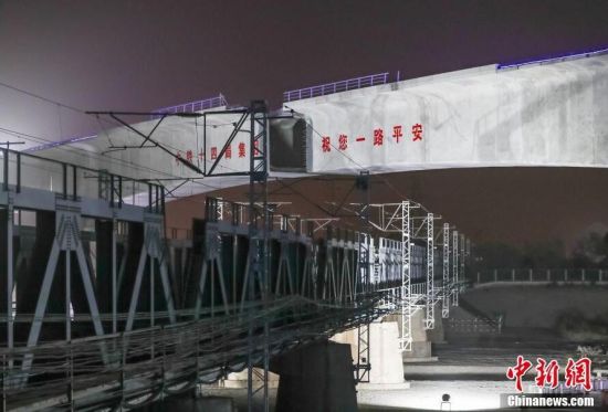 5月8日凌晨1点50分,经过近1小时的封闭施工,北京丰台站改建工程跨京广铁路特大桥转体成功。该桥全长4351米,由中铁十四局承建。 中新社记者 贾天勇 摄