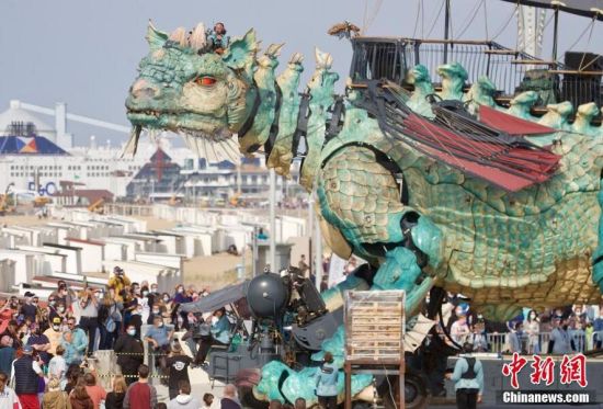 当地时间2021年7月13日,法国加来,人们参观12米高、25米长的机械“龙”。 图片来源:视觉中国