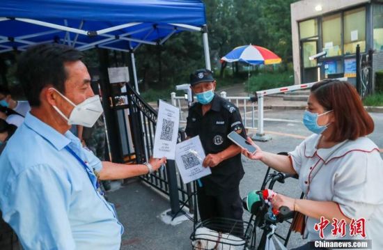 8月22日下午,位于北京市房山区的乐活城北区和千禧家园两小区解封。至此,房山区封控管理区域清零。图为乐活城北区解封后,居民扫健康码进入小区。 中新社记者 贾天勇 摄