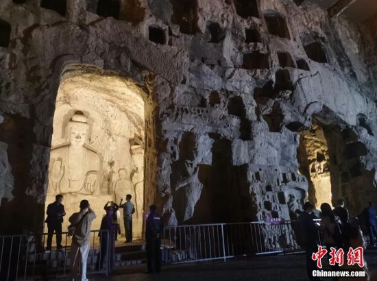 10月14日晚,夜幕下的河南洛阳龙门石窟在连绵灯光的衬托下蔚为壮观、神秘莫测,吸引游人山间夜游。图为游客在佛像前拍照留影。 中新社记者 刘鹏 摄