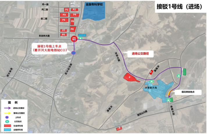 乘坐地铁2号线在雾开河大街站C口出站,换乘接驳1号线公交车,前往冰雪新天地1、2号门。(如下图)