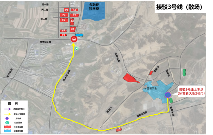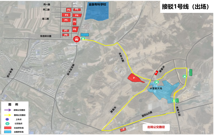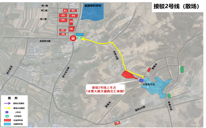 1号门:出园游客在冰雪新天地1号门(天健路公交车临时站点)乘坐接驳2号线公交车返回地铁雾开河大街站B口,换乘停车场摆渡车,返回临时停车场。(如下二图)