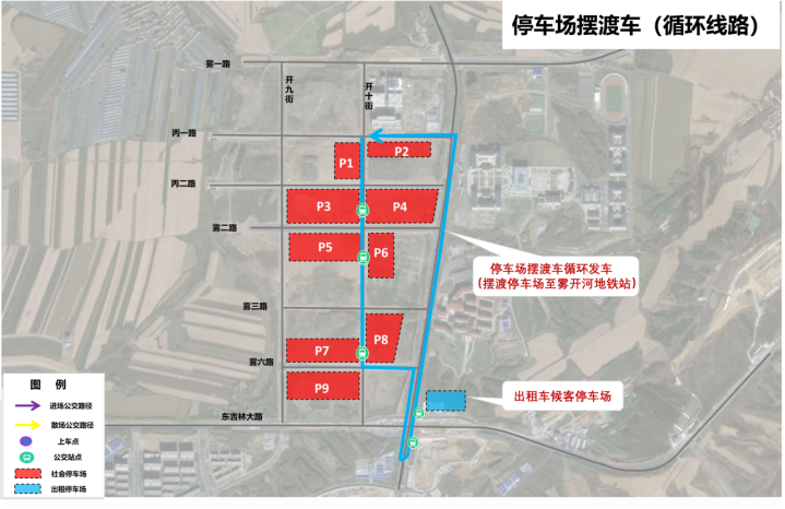 2号门:乘坐接驳3号线公交车,返回地铁雾开河大街站C口;换乘停车场摆渡车,返回临时停车场。(如下二图)