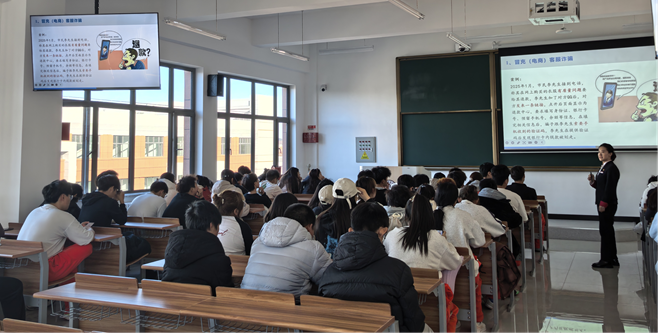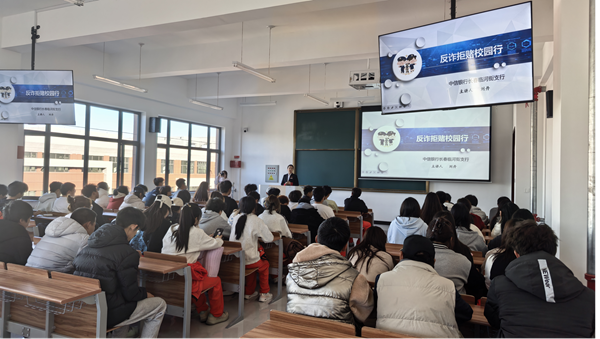 活动现场,临河街支行的工作人员结合高校校园诈骗的高发特点,以通俗易懂的语言为师生们带来了一场干货十足的反诈宣讲。宣讲环节中,工作人员首先从“什么是电信网络诈骗”切入,系统讲解了电信网络诈骗的定义、常见类型及隐蔽性、迷惑性特点,让师生们对这类违法犯罪行为建立起清晰认知。随后,通过“以案说诈”的形式,工作人员选取了近年来高发的校园贷、刷单返利、冒充老师同学借钱、虚假购物退款等典型诈骗案例,深入剖析了诈骗分子的作案手法、话术陷阱以及受害者的受骗心理,用真实案例敲响安全警钟,让师生们直观感受诈骗的危害性。