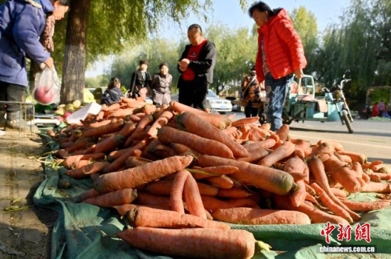 10月16日,吉林长春,市民在挑选胡萝卜。当下正是中国东北民众“囤秋菜”的季节,满载大葱、白菜、胡萝卜等秋菜的货车停靠在长春市区指定销售区域,市民们穿梭挑选,忙碌地储备过冬秋菜。中新社记者 张瑶 摄