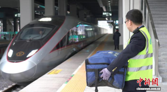 中新网长春11月4日电(张瑶 孙晓晨)11月4日11时许,在通化站高铁站台上,工作人员将装载人参、鹿茸、灵芝孢子粉等货品的高铁快件装上G944次高铁列车,3.5小时后,这些货物将抵达目的地北京朝阳站。作为高铁快运“新成员”,沈佳高铁沈白段在开通满月之际,迎来了网购快件运输高峰。