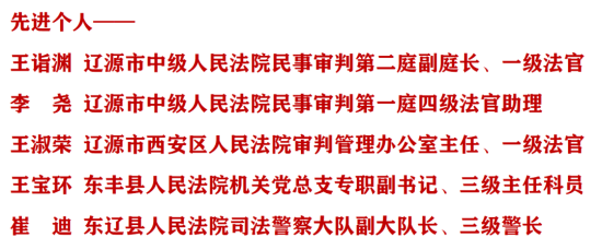 中新网吉林新闻2月20日电 (谭伟旗 金钰淇)为了表扬先进、激励队伍,近日,吉林省高级人民法院对全省法院“奋进新征程 建功新时代”先进集体、先进个人予以通报表扬,辽源市两级法院3个集体5名个人获表扬。