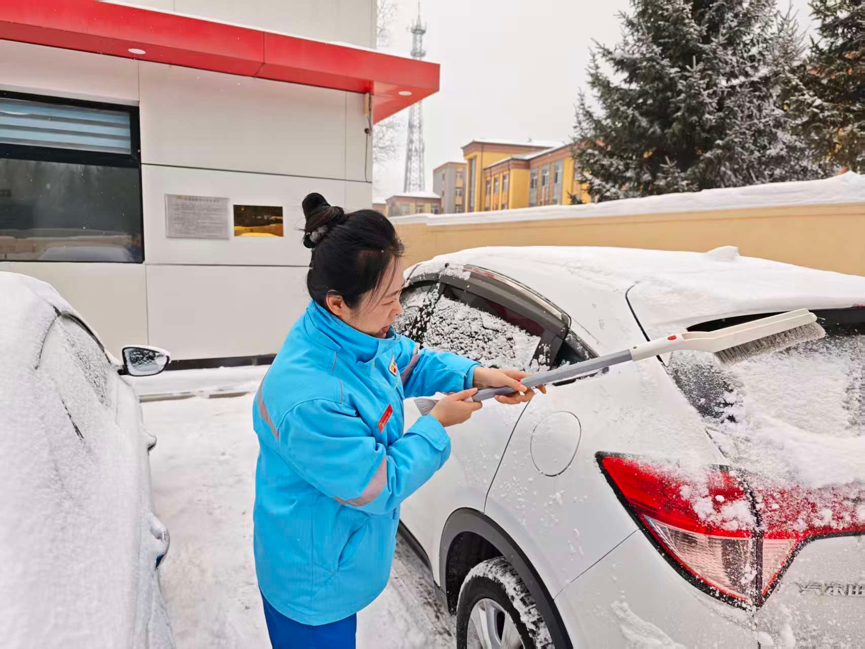白山分公司三岔子站员工化身“清雪卫士”,手持清雪工具,为每一辆进站车辆仔细清扫挡风玻璃与车灯上的积雪冰霜,保障行车视线清晰。“雪天开车最怕视线不清,你们帮忙清理干净,心里一下子就踏实了。”司机王师傅由衷地感谢。