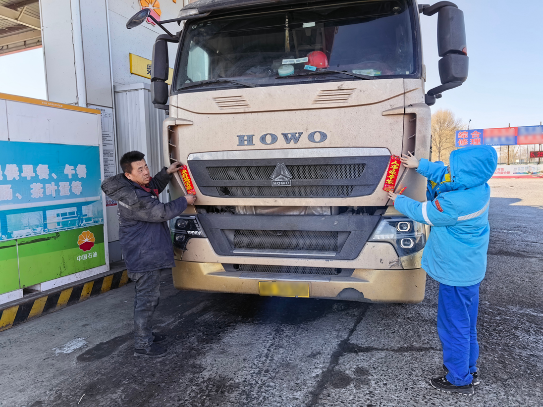 吉林市分公司磐石烟筒山站内,红灯笼错落悬挂,节日商品琳琅满目,休息区姜茶暖香四溢。“师傅,您跑长途返乡,胎压有点偏低,需要帮忙调整吗?”加油员一边加油,一边细心提醒,细致服务赢得司机连连道谢。