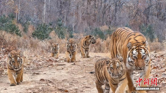 中新社长春12月26日电 (记者 郭佳)记者26日从东北虎豹国家公园管理局获悉,今年11月8日,在公园的珲春片区监测到一只雌性野生东北虎带领五只幼崽出现,这是中国首次拍到“六虎同框”影像。