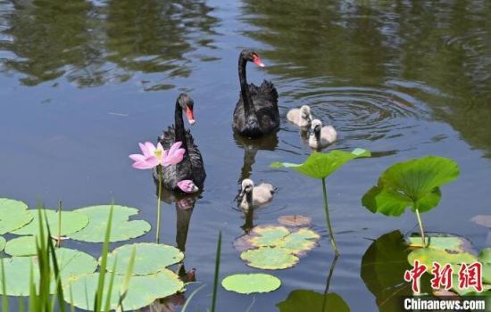 7月30日,在位于吉林省长春市的百花园内,三只刚刚出生的黑天鹅宝宝乖巧地守在爸爸妈妈身边,畅游荷花池,十分惬意。(中新社记者 张瑶/摄)