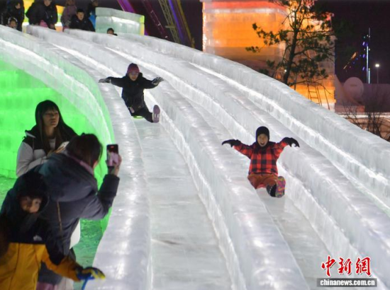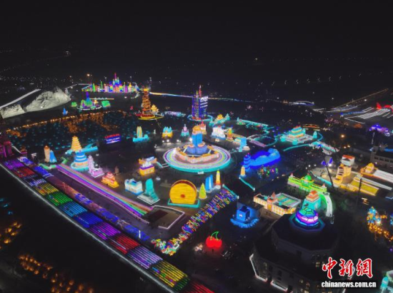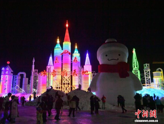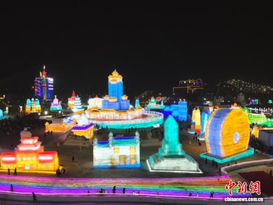 12月19日晚,长春冰雪新天地开门迎客。2025-2026雪季的长春冰雪新天地占地面积156万平方米,开发了76万平方米的冰雪游乐空间,总用冰用雪量达85万立方米,冰雪雕塑200余座。随着夜幕降临,冰雕景观亮灯,整个园区仿佛一座如梦如幻的冰雪王国。中新社记者 张瑶 摄