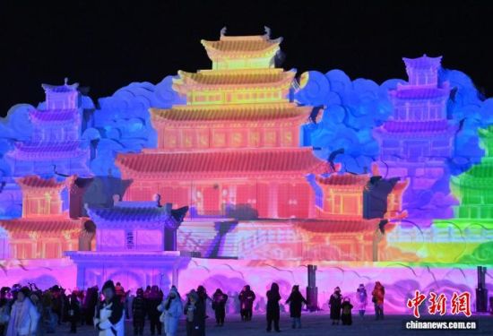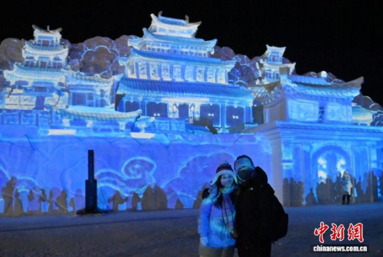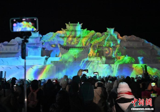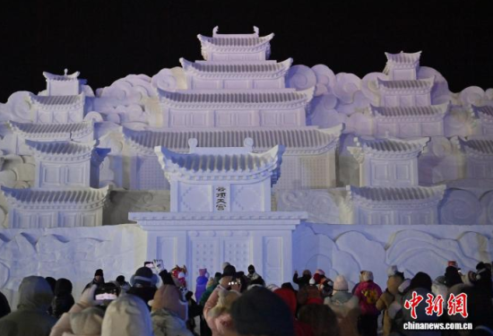 12月26日晚,吉林长白山,新落成的高30米、宽70米、用雪量10万立方米的雪雕版“云顶天宫”正式点亮。这座以探险题材小说《盗墓笔记》为蓝本雕琢的冰雪地标广受书迷关注。中新社记者 张瑶 摄