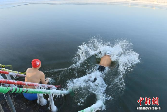2026年1月1日,在长春南湖公园,冬泳爱好者在湖水中畅游。当天,近百名冬泳爱好者齐聚南湖,以冬泳的方式迎接新年。中新社记者 张瑶 摄