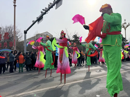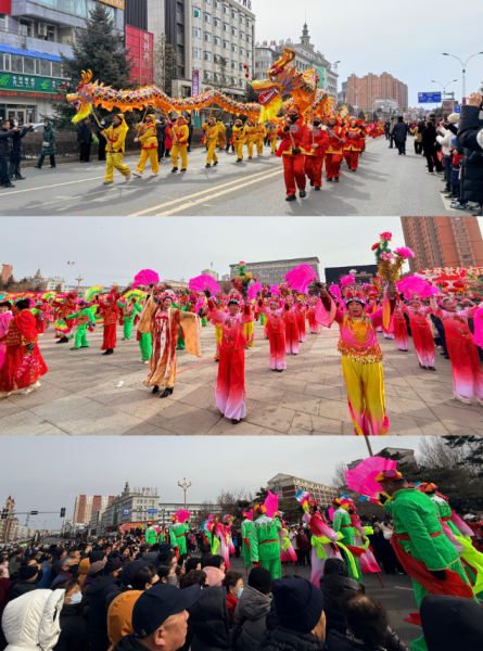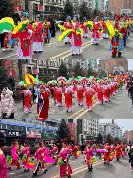 20支秧歌队伍从大剧院出发,沿南湖大街至敖东大街与长白路交汇处行进展演,传统东北大秧歌、满族秧歌轮番登场,踩高跷、舞龙舞狮……各类非遗绝活悉数展现。乐队唢呐与锣鼓镲交织出快慢错落的传统曲牌,演员们将秧歌的精髓演绎得淋漓尽致,成为街头流动的风景线,队伍一路载歌载舞,所到之处欢呼不断,喜庆氛围遍布敦城街巷,生动展现“吉祥敦化”的和谐盛景。