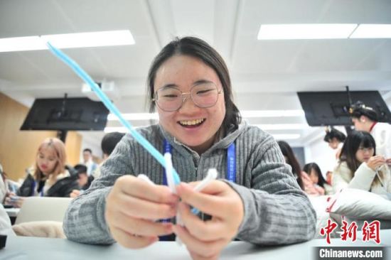 青年台胞在制作汉服手工仿绒花雪花胸针。