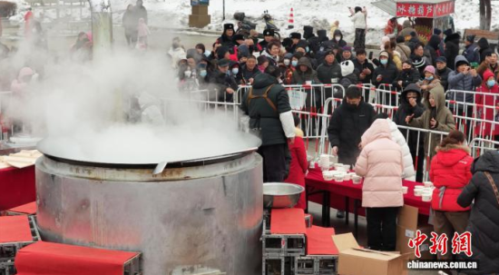 当天,数千市民、游客聚集在北山人民广场,等待年猪烩菜出锅。严寒之中,铁锅腾起的阵阵雾气格外醒目,偶尔飘落的雪花,更给这场露天美食体验增添了韵味。