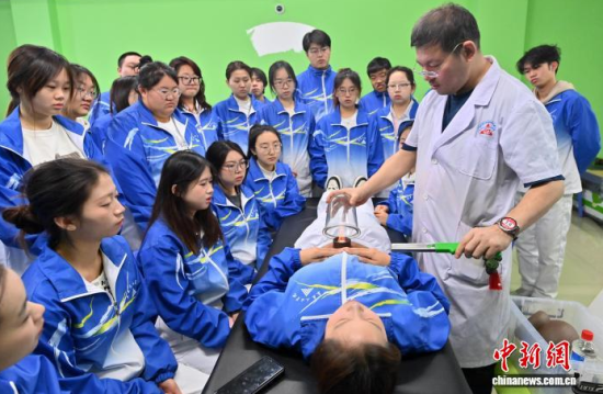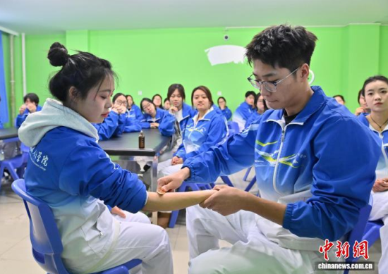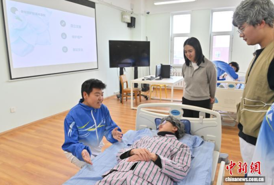 12月15日,在长春人文学院,学生在实操介护技术。面对老龄化进程与银发经济发展,该校开设了养老服务管理专业,融合管理学、心理学、护理学等,设置介护福祉综合实训、老年康乐活动策划与实施综合实训、智慧养老实务等近30门课程,培养既懂运营管理又具备实操技能的复合型人才,吸引年轻人投身这一“朝阳产业”。中新社记者 张瑶 摄