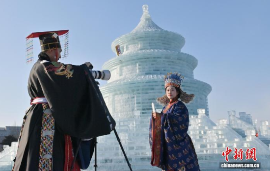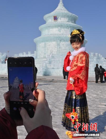 1月24日,长春市文化广场上,众多汉服爱好者齐聚巨型冰雕“祈年殿”前拍照留念。该冰雕以北京天坛为原型,通体晶莹,飞檐斗拱皆现冰雪之韵。衣袂飘飘的汉服身影与剔透冰雕相映成趣。中新社记者 张瑶 摄