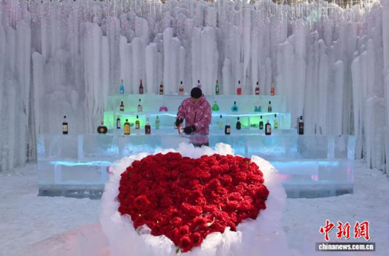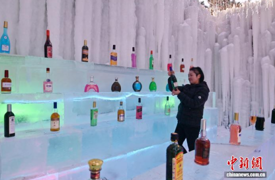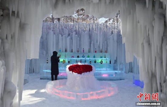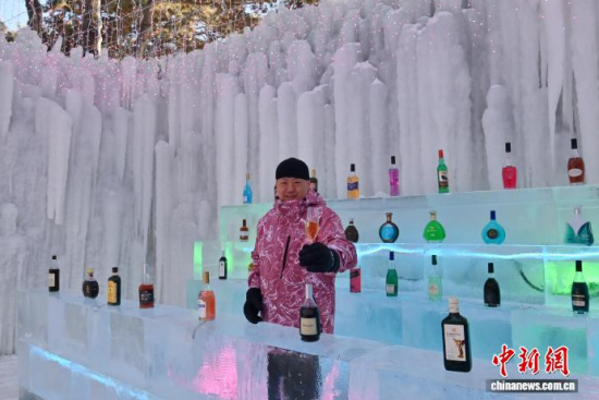 2月3日,位于长春冰川幻境冰雪乐园内的一座由冰瀑打造而成的特色“酒吧”,吸引了大量游客前来打卡体验。酒吧内部以冰雪为主题,晶莹剔透的冰沙发与冰吧台相互映衬,营造出梦幻般的冰雪世界氛围。中新社记者 张瑶 摄
