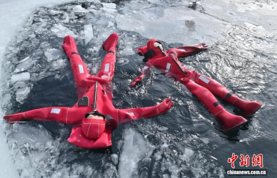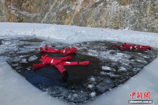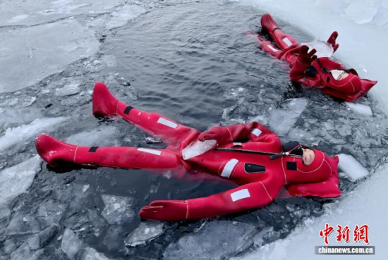 2月5日,吉林省长春市,一项独特的冰浮项目吸引众多游客前来体验。在严寒天气中,参与者身穿醒目的红色浮力装备,悠然漂浮于冰面之上,感受别致的冰雪乐趣。图为游客在下水前拍照留念。中新社记者 张瑶 摄