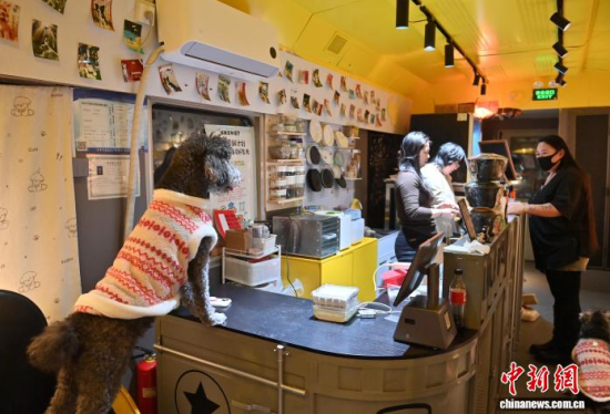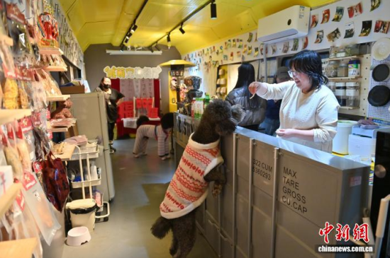 2月11日,吉林长春,小狗在火车车厢主题宠物餐厅旁经过。该餐厅集宠物餐饮、游乐与社交功能于一体,为宠物打造沉浸式用餐体验。临近春节,后厨正加紧赶制宠物年夜饭,新年礼盒供不应求,不少宠主早早预订“车厢座位”。中新社记者 张瑶 摄