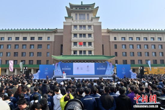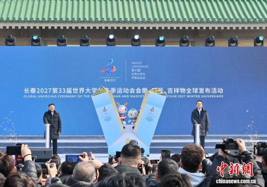 3月21日,长春2027第33届世界大学生冬季运动会在长春发布会徽、吉祥物及赛事口号。会徽定名“春长”,吉祥物名为“吉冰”“吉雪”,赛事口号为“逐梦冰雪,长驻青春”。2027长春大冬会将在长春市、吉林市举办,当天是倒计时300天。图为大冬会吉祥物“吉冰”“吉雪”亮相长春街头。中新社记者 张瑶 摄