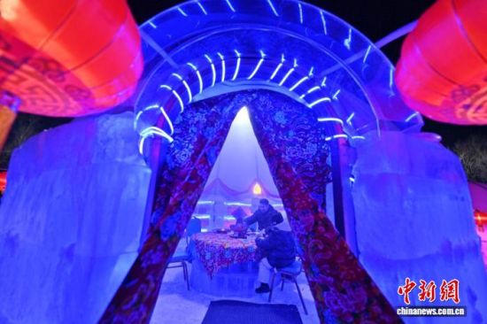2月4日,在吉林长春世界雕塑园内,一座晶莹剔透的冰屋中热气缭绕,来自上海的游客围坐在冰桌前,品尝着沸腾的火锅,亲身体验“冰火两重天”的奇妙感受。张瑶 摄